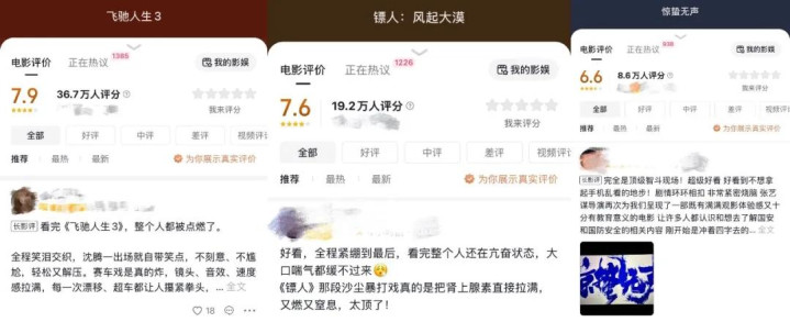 翻看三部影片在榜单下的高频议论,会发现不管是赛车狂飙的刺激、暗战交锋的窒息,如故大漠乱战的惨烈,不雅众的不雅影体验零星地一致:“燃到爆炸”“看得东谈主手心冒汗”“像坐过山车相同”,高度相似的评价明晰地指向头部影片共同的心理内核——热血。