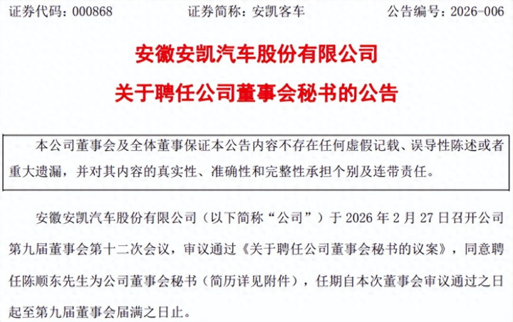2月27日晚间,安徽安凯汽车股份有限公司发布对于聘请公司董事会秘书的公告。安徽安凯汽车股份有限公司(以下简称“公司”)于2026年2月27日召开公司第九届董事会第十二次会议,审议通过《对于聘请公司董事会秘书的议案》,欢喜聘请陈顺东为公司董事会秘书(简历详见附件),任期自本次董事会审议通过之日起至第九届董事会届满之日止。