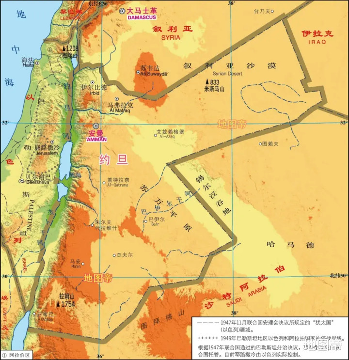 约旦西部为约旦河-死海谷地,中部为高原瘠土,东部为沙漠,沙漠约占或者,最岑岭为乌姆达米山,海拔1854米。