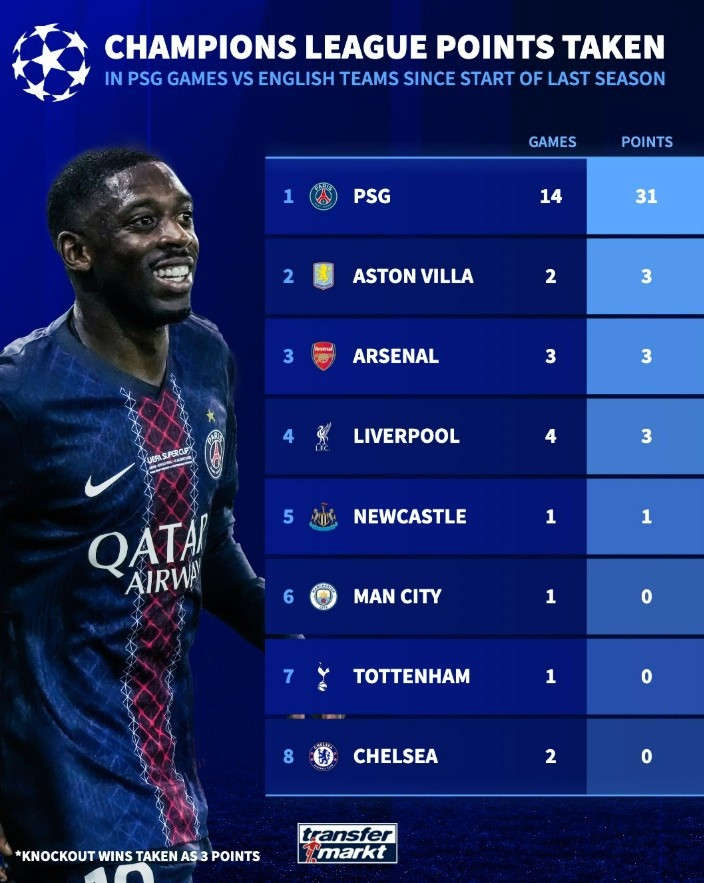 巴黎在近两个赛季欧冠14次对阵英超球队拿到31分(淘汰赛取胜也作为3分),而对阵巴黎战绩最佳的维拉也仅是2战1胜1负,开云体育app阿森纳3战1胜2负,利物浦4战1胜3负开云,纽卡1平,曼城、热刺均是1战1败,切尔西则是2战2败。