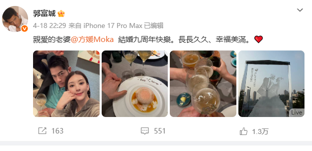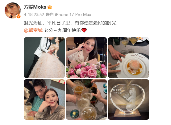 2026年4月18日,郭富城与方媛迎来娶妻九周年牵挂日,天王在酬酢平台晒出庆祝动态,配文“长长期久、幸福十足”,而配图中一款刻有二东说念主婚纱照和“持子之手,与子偕老”字样的水晶摆件,或然掀翻全网热议——这款贪图守旧、格调从简的摆件,竟是网购平台常见的平价名堂,单价不足百元,与郭富城的天王身价酿成横暴反差。